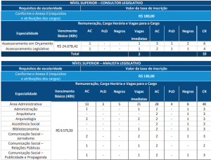 O cargo de Assistente Legislativo (nível médio, sem especialidade) é o grande destaque, com 74 vagas imediatas e remuneração inicial de R$ 6.503,00, além de benefícios como: